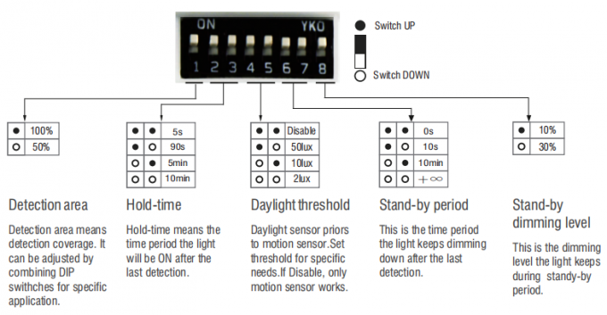 Свет включится, когда люди войдут в зону обнаружения; после того, как люди уйдут, свет будет гореть в течение некоторого времени, которое мы называем «временем удержания»; по истечении «времени удержания» свет перейдет на низкий уровень и будет гореть некоторое время, что называется «затуханием в режиме ожидания» и «периодом ожидания»; по истечении периода ожидания свет выключится.